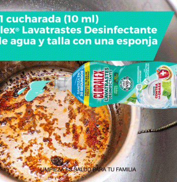 Agrega 1 cucharada (10 ml) de Cloralex Lavatrastes Desinfectante en 1/2 L de agua y talla con una esponja o fibra.