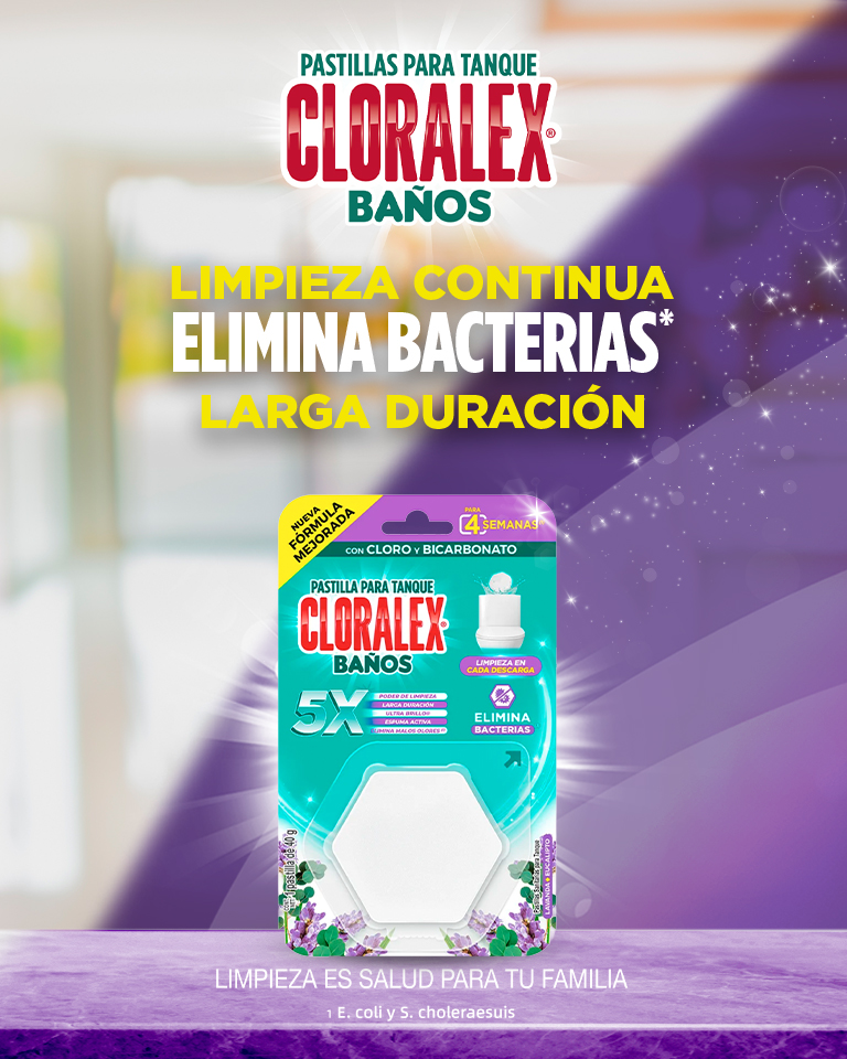 Mantén tu baño limpio por más tiempo con las pastillas blancas de Cloralex® Baños. Su nueva fórmula mejorada 5X con cloro y bicarbonato ofrece mayor poder de limpieza, larga duración y ultrabrillo®.